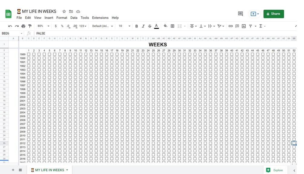 MY LIFE IN WEEKS Google Sheets Template